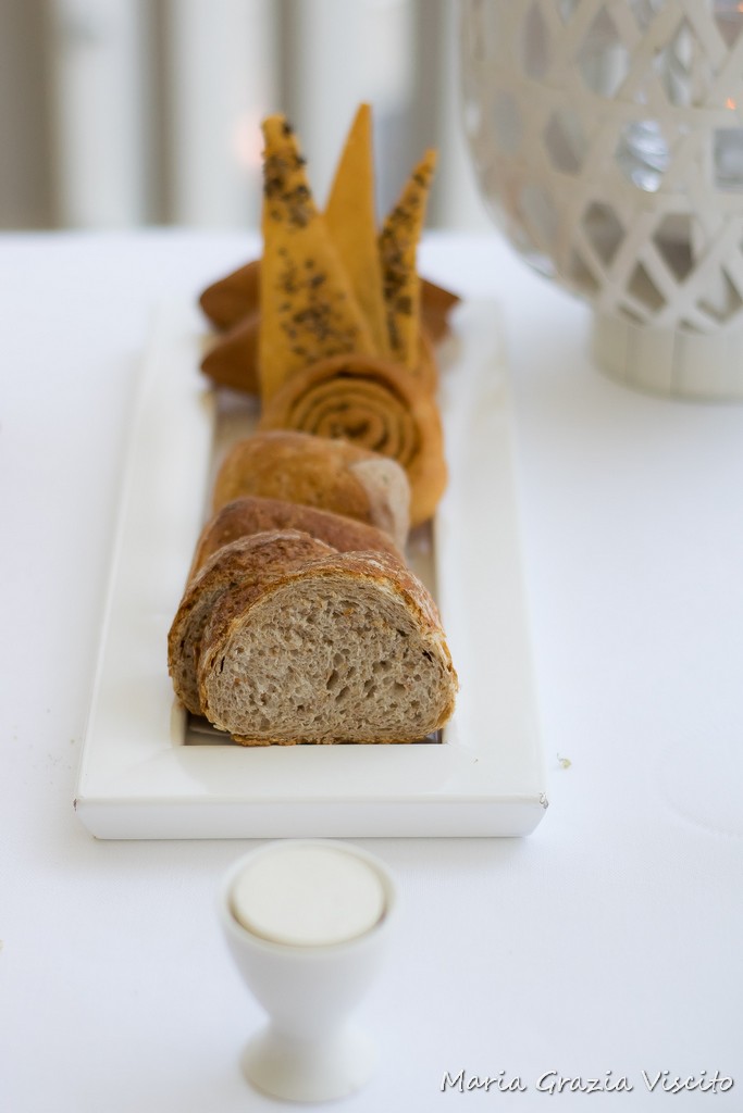 Arrivano i grissini, le alghe e il KirRoyal, accompagnato dai vari tipi pane “fatto dai ragazzi” e dal burro con acqua di ostriche. Il burro con acqua di ostriche l’ho quasi guardato con sospetto e poi mi sono sciolta al primo assaggio. Sapevo che dopo avremmo avuto tanto altro ma non mi sono sentita di privarmi dell’assaggio di ogni singolo tipo di pane. Vorrei poter dire che era per puro spirito di osservazione ma era talmente buono che sarebbe una bugia.