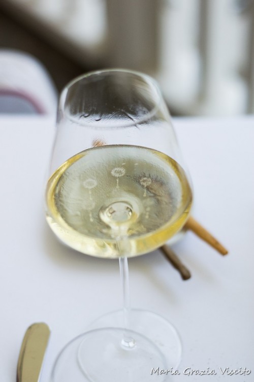 Il fondente di patate, anatroccolo, radici di erbe di campo e tartufo nero. Confesso che qui, come un’altra coppia vicino, un po’ di rimorso solo a sentire la parola anatroccolo, s’è provato. Ma solo prima dell’assaggio, perché subito dopo aver assaggiato, abbiamo convenuto che l’anatraccolo avesse fatto una degna fine, avvolto fra il fondente di patate e lo strato generoso di tartufo. In un menù quasi tutto di pesce il piatto di carne, che fa scordare ogni tipo di sentimentalismo per l’anatroccolo, ti induce a pensare “è straordinario anche con la carne”.