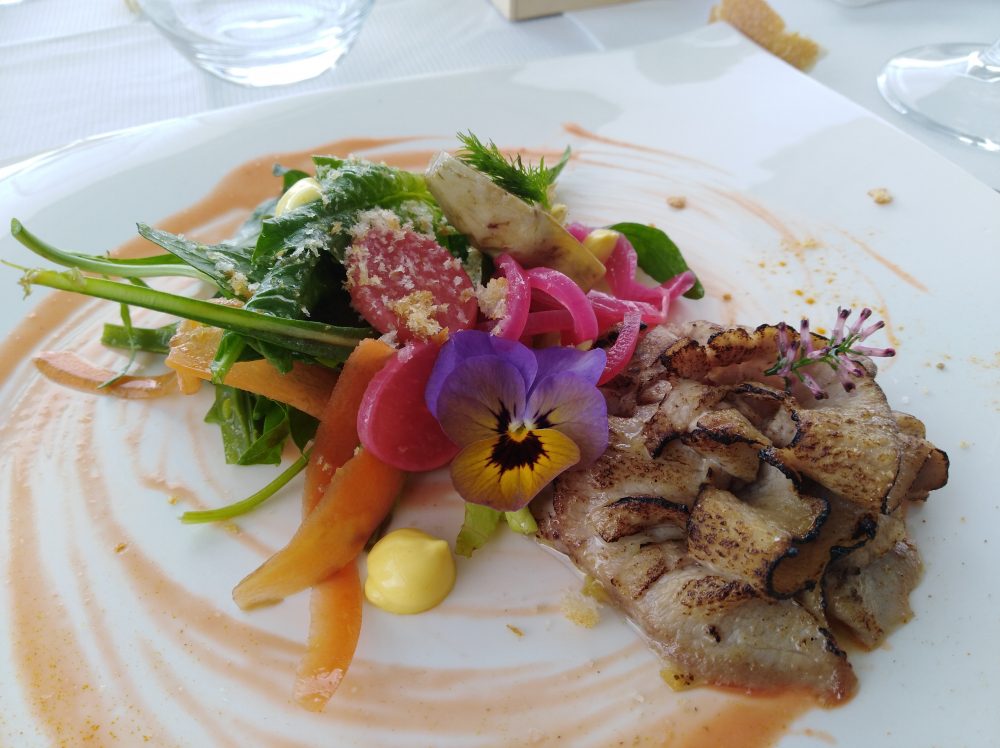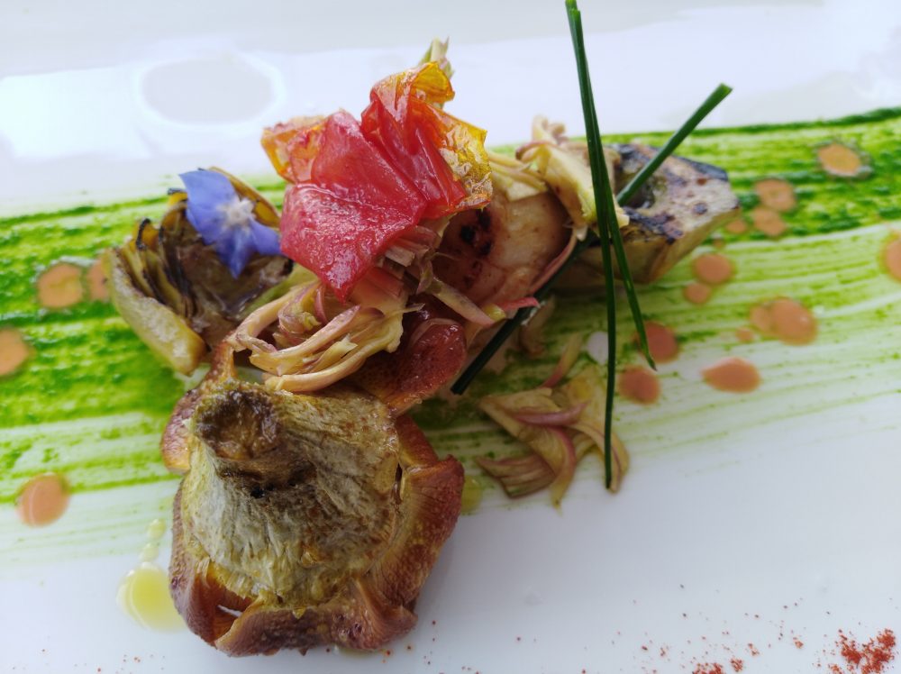 E che dire poi del piatto successivo di Capasanta scottata e tre diversi modi di presentare il carciofo: crudo, grigliato e fritto? Un vero capolavoro, con il mollusco che si presenta bello sodo, tenero e gustoso, mentre i carciofi, che come sappiamo amano un clima più fresco che caldo, in questo ambiente più autunnale che primaverile si trovano perfettamente a loro agio. Carnosi e leggermente amarognoli al punto giusto.