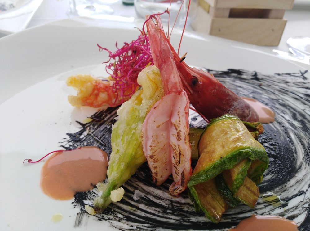 Ristorante Melchio’ – Gamberone rosso nostrano, fiore di zucca farcito di ricotta e zucchine alla scapece