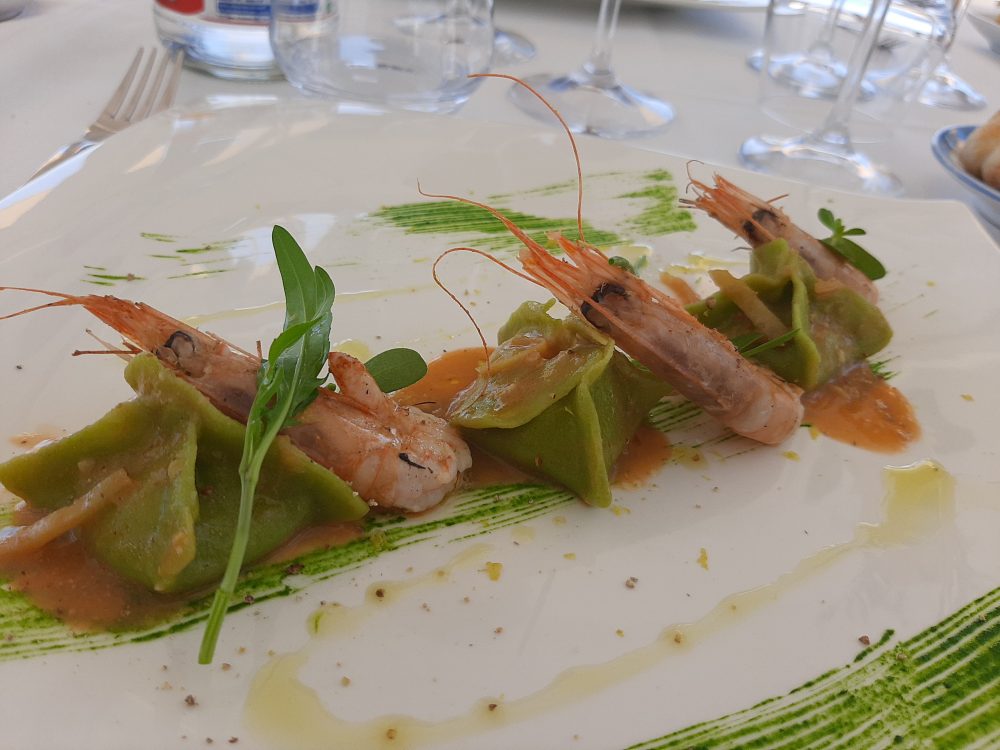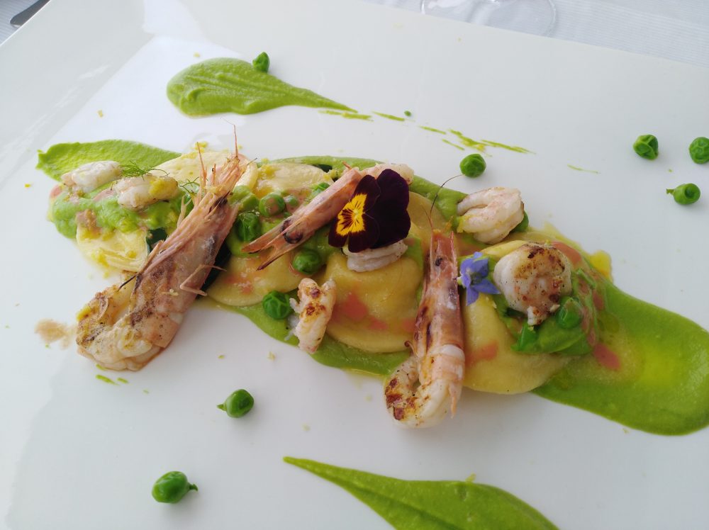 Ristorante Melchio’ – Ravioli ripieni di ricottta d’Agerola, crema di piselli, gamberi grigliati e limone grattugiato