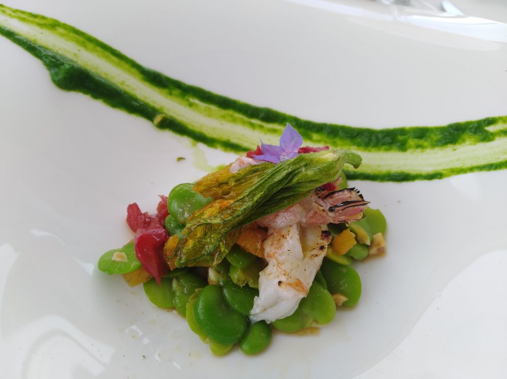 Per antipasto lo Scampo al cannello, marinata di fave e nocciole di Giffoni. Bene, nel piatto ci sono tutti gli ingredienti giusti per formare un assemblaggio sfizioso, gradevole, fresco, leggero e croccante.