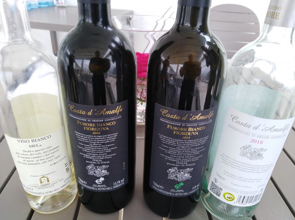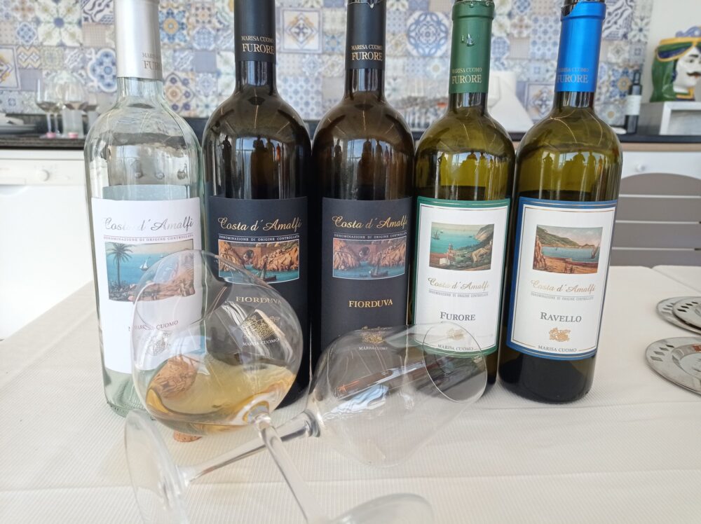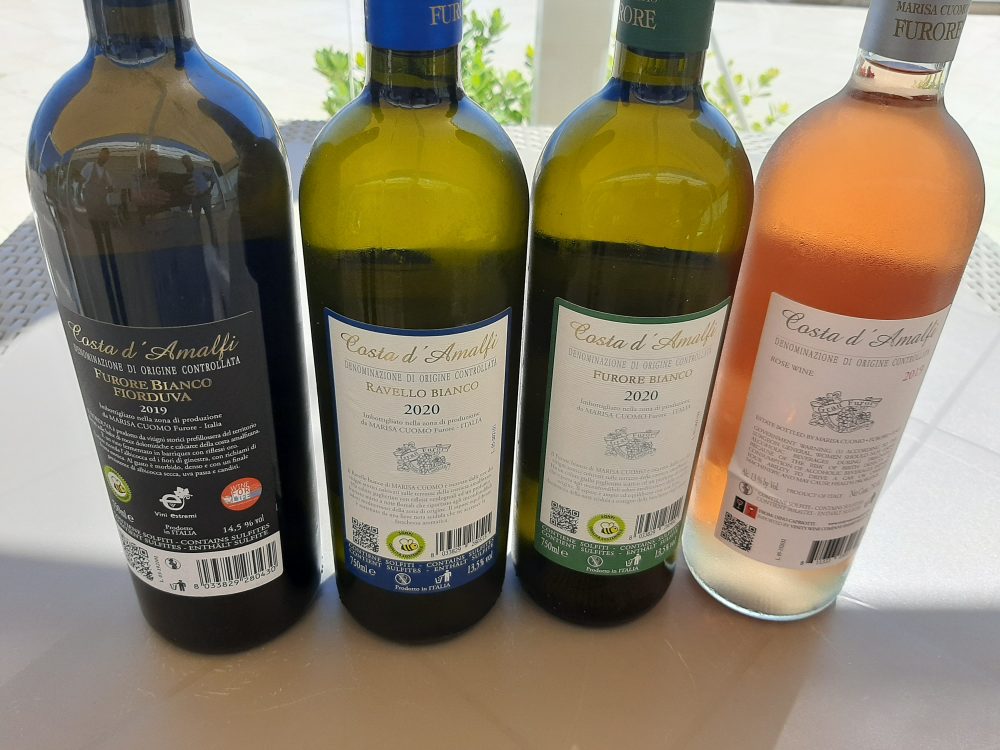 Per accompagnare tutto il pranzo ecco qui quattro bottiglie di Marisa Cuomo: Furore bianco 2020, Ravello bianco 2020, Rosato 2020 e Fiorduva 2019.