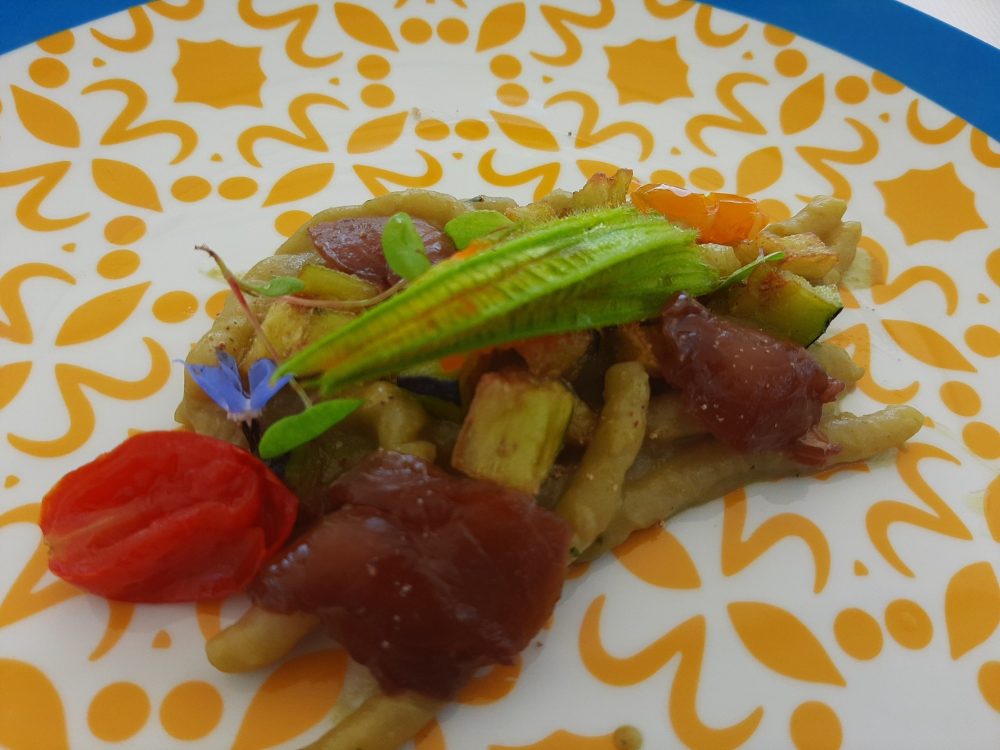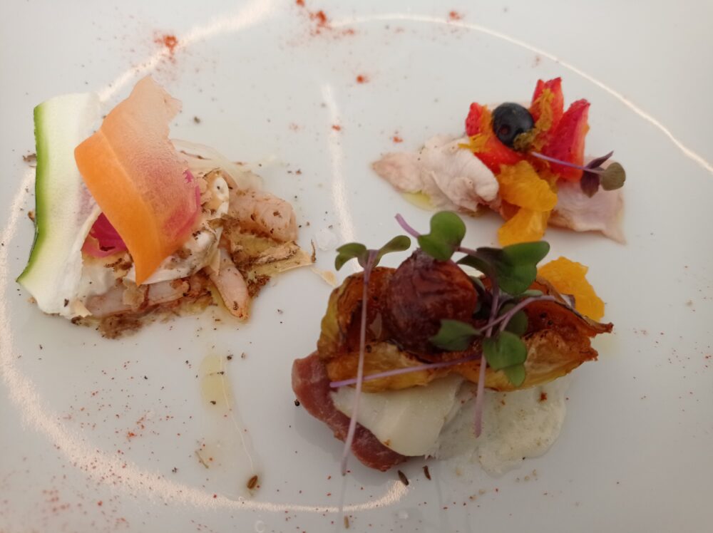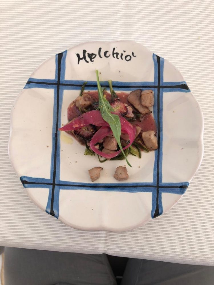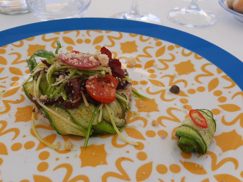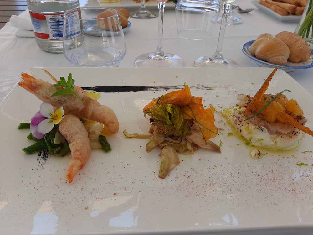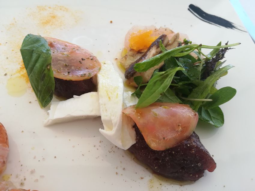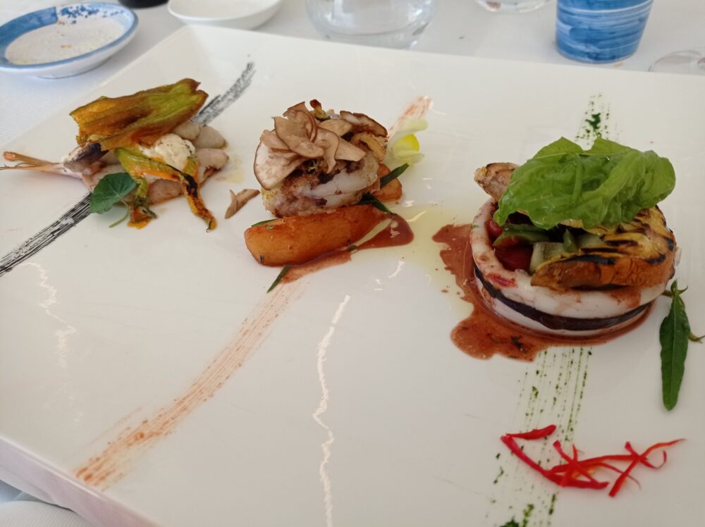 Una sfilza di eccellenti antipasti ha dato inizio alle danze: zucca lunga fritta con calamaretti fritti ed ovuli nostrani; ricci di mare; lampuga marinata all’arancia con fragole bio e pezzetti di arancia; tonno alalunga con dressing di colatura, soia, provola e fichi bianchi essiccati con finocchietto selvatico; gamberi bianchi con burratina di Agerola, tartufo nero estivo e cipolla rossa in agrodolce; totani locali grigliati ripieni di cianfotta di melanzane, totano stufato e ovuli grigliati; seppiolina locale ripiena di zucchine alla scapece, pesca bianca in infusione di timo e porcino in lamelle; triglia locale scottata, fiore di zucca ripieno di ricotta e porcini piastrati.
