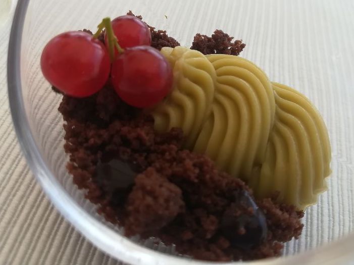 Dolci a go go per terminare l’ottimo pranzo. In successione predessert con cremoso al pistacchio, terra di cacao e coulis ai frutti di bosco; babà al rum con crema morbida al limone; bignè al latte cremoso al mascarpone e glassa rocher; cake al limone, streusel al pistacchio e gelato alla vaniglia. Dolci buonissimi, defaticanti e poco zuccherini.
