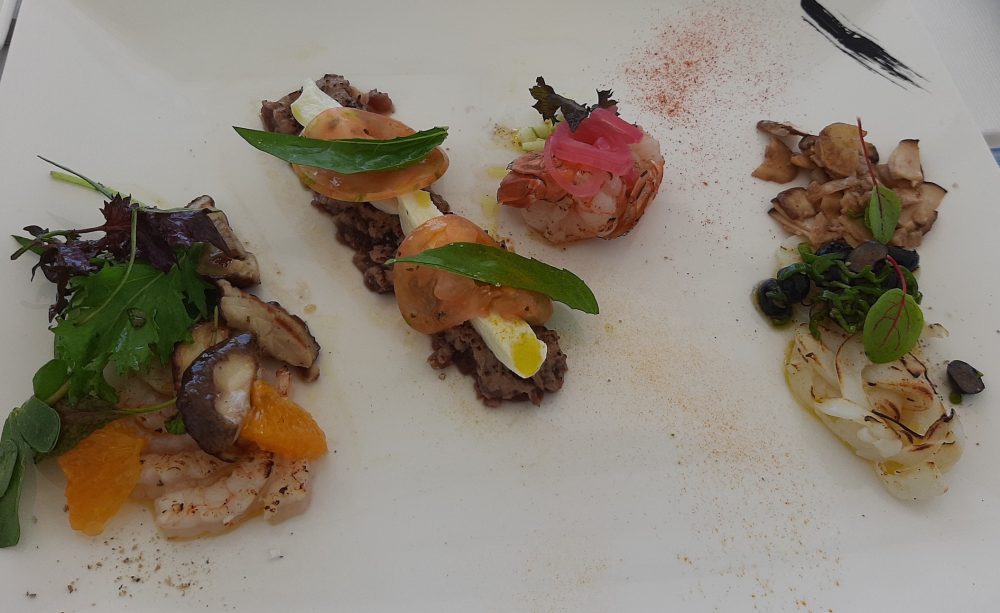 Subito dopo ecco qui una nutrita composizione di un ricco e sfizioso antipasto, comprendente tagliatella di seppia con insalatina di funghi porcini, friggitelli e porcini; scampo crudo con cipolla rossa di Tropea in agrodolce e mela verde; tartare di tonno, mozzarella di bufala e basilico; carpaccio di gamberi e misticanza di stagione; porcini grigliati e arancia. Piatto ben bilanciato e segnato da un’ottima acidità.
