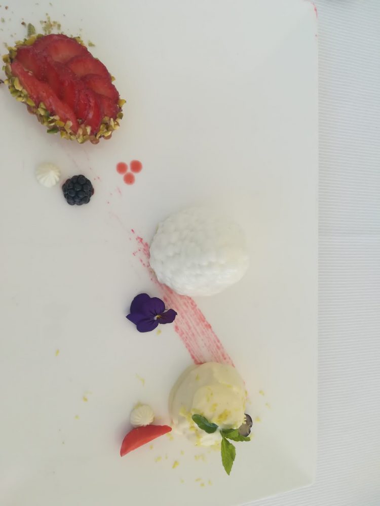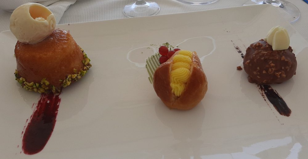 Tris di dolci: mousse al limone con gel di gelso, con base di Pan di Spagna e profumato al limone; profiteroles con ripieno di namelaka al cioccolato bianco e ricoperto di crema morbida al limone e vaniglia; crostatina con fragole fresche. Dolci freschi, squisiti, deliziosi e cremosi, in piena sintonia con tutto il resto del pranzo.