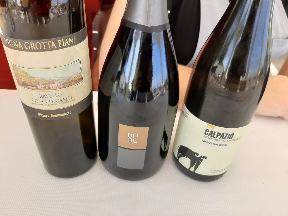 Tre le bottiglie di vino scelte da Andrea Ferraioli: Vigna Grotta Piana Ravello Costa d’Amalfi di Ettore Sammarco, Calpazio Greco Paestum di San Salvatore 1988 e Spumante Brut Dubl Falanghina Metodo Classico di Feudi di San Gregorio.