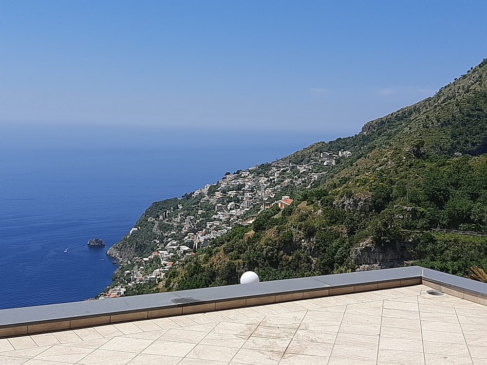 Nel frattempo è stata costruita una minimale e scenografica sala sulla terrazza appena entrati, che guarda il magnifico mare sottostante ed è posizionata proprio di fronte al presepiale abitato di Praiano.