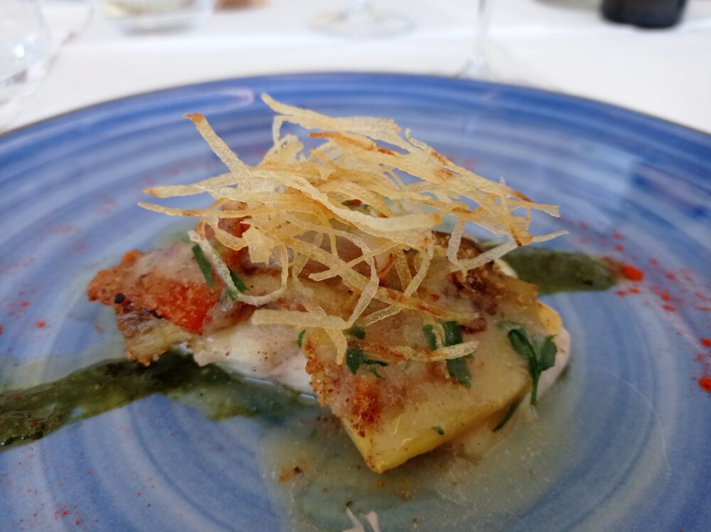 Crocchetta di patate e pesce bianco con carciofo grigliato, uova di palamita in salamoia e maionese alle acciughe. Eccellente esecuzione di un piatto coreografico, saporito e ben bilanciato.