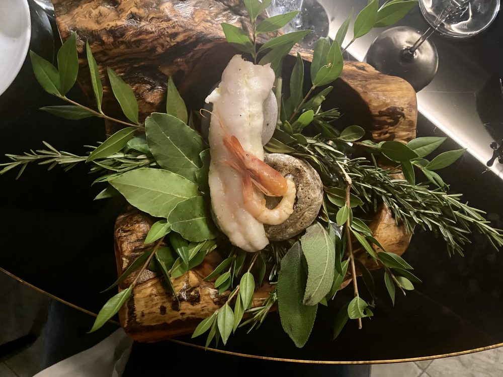 Imperdibile il Pescato di Spigola di mare e gambero, cotti su pietra proveniente dal litorale della Costiera, servito al tavolo su radici di legno di ulivo e un letto di alloro, salvia, mirto e rosmarino. Un piatto mediterraneo che vale la pena assaggiare.