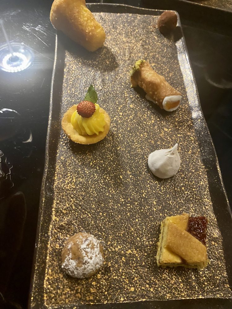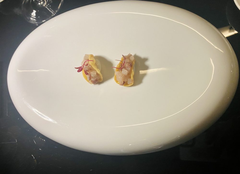 Il menù, legato alla stagione e con forte presenza del pescato, oltre ai piatti alla carta, offre la possibilità di scegliere un percorso di degustazione da 75,00 €, che sale a 100,00 € con l’abbinamento dei vini. Prevede quattro piatti, più l’aperitivo e il predessert. Ed è un bell’entrèe l’amuse bouche di Spuma di mais, polpettina di baccalà pastellata, maionese di baccalà e riso soffiato al nero di seppia; Tacos di cannolo con tartare di orata.