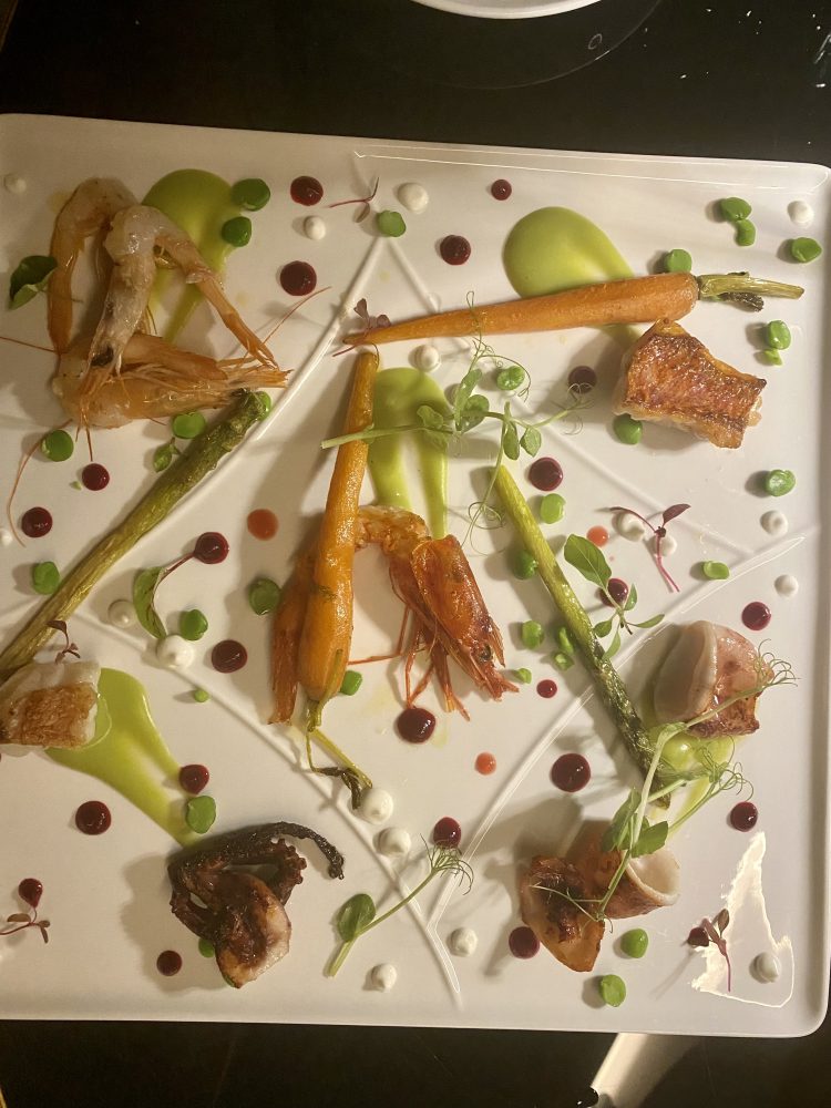 È l’antipasto Primavera che racconta la scelta delle materie prime di primissima qualità e la delicatezza della mano dello chef: scampo, triglia, polpo, totano, preparati con cotture diverse e racchiusi in un unico piatto accompagnato con la crema di piselli (gli ultimi della stagione), carote baby, asparagi, fave, friggitelli, gazpacho di barbabietola, maionese di soia e maionese di mare. Completano la preparazione i germogli di piselli.