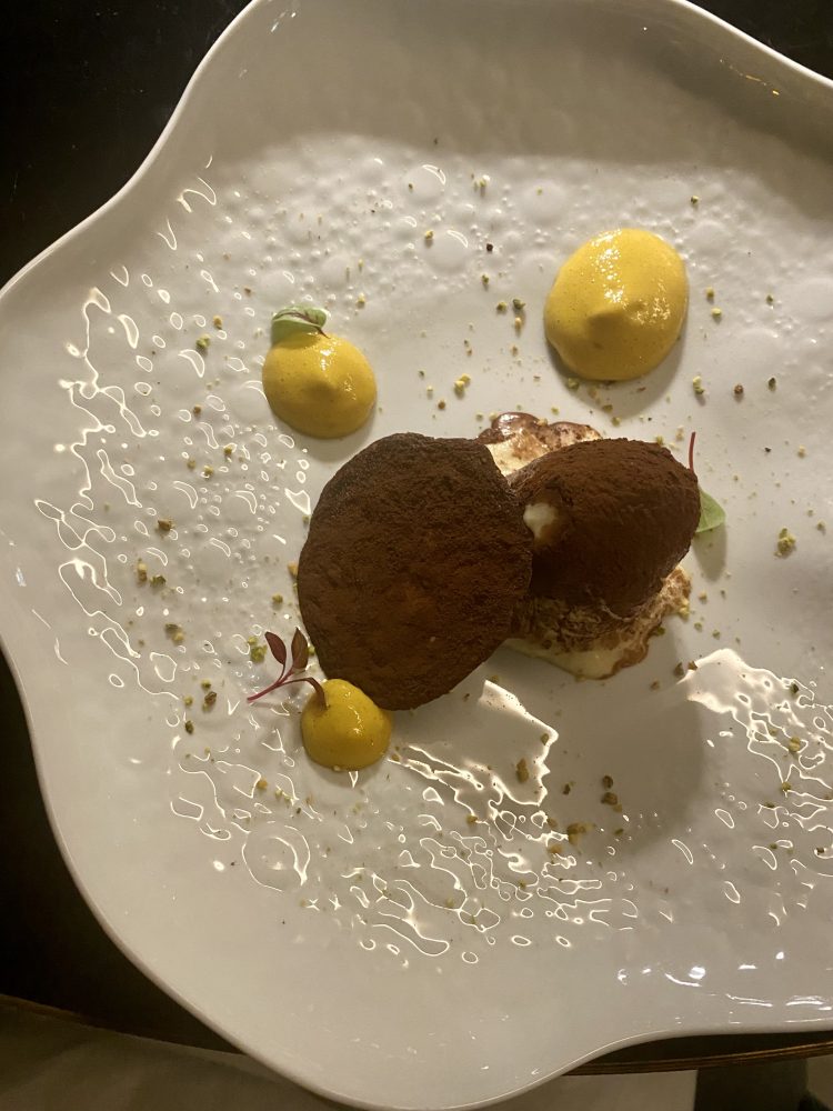 Come pre dessert la Panna cotta al limone su crumble al limone prima della Millefoglie con crema diplomatica alla vaniglia, lampone liofilizzato e zabaione al lampone. Per i vegetariani tiramisù vegano, savoiardo di riso, polvere di porcini e gelato al ginseng.