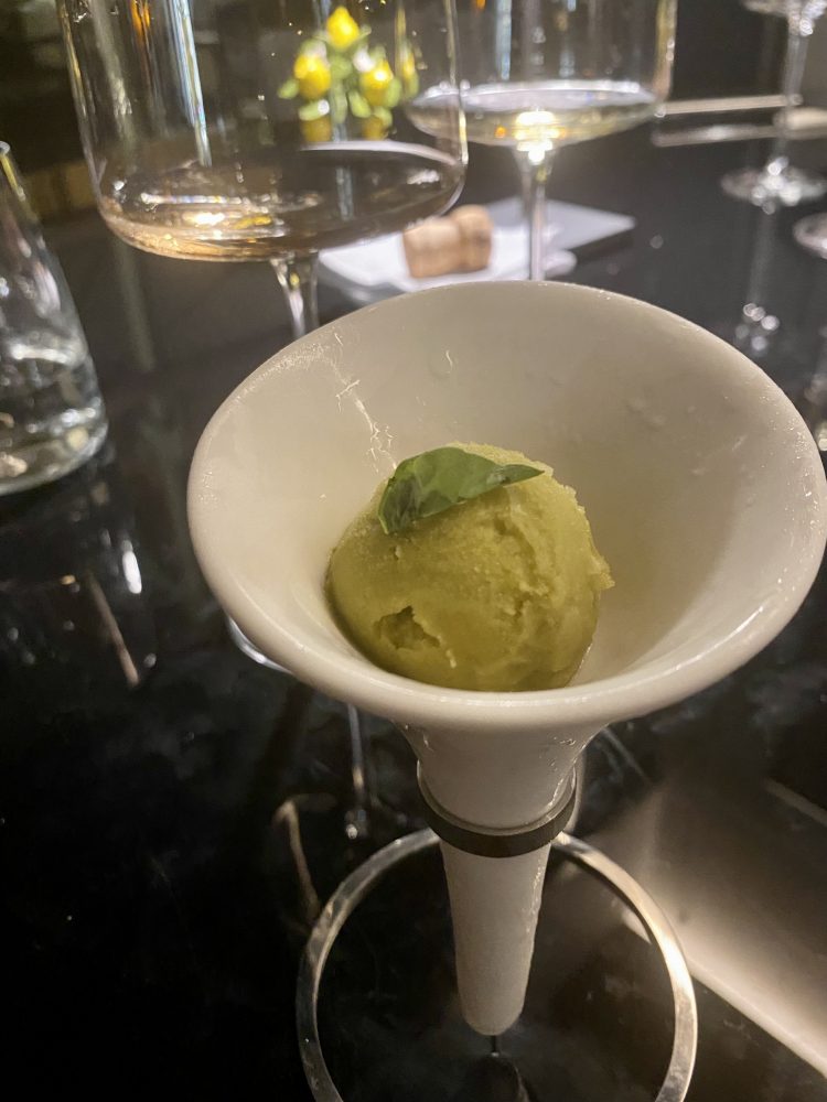 Il Sorbetto al basilico prepara all’ equilibrato dessert di Semifreddo di amaretti, spuma di nocillo e cialda croccante di cacao.