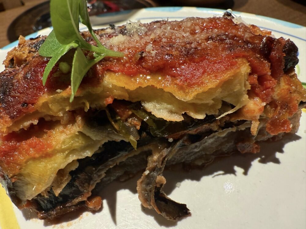 E poi arriva lei, la parmigiana, con le melanzane dell’orto di casa: rustica, generosa, un po’ come chi la prepara. Piccola cucina di supporto per contorni, primi, dessert, ma il cuore resta la brace.