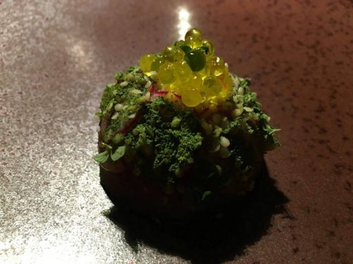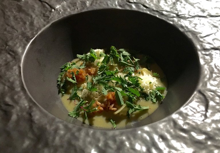 Altro piatto difficile, dove il risultato finale è dato dall’equilibrio delle componenti che apparentemente sembrano staccati ma che poi vengono riunificati dall’acidità del frutto. Penso che altri avrebbero pensato alla soluzione di un infuso o di un brodo, ma qui si vede la voglia di alzare l’asticella oltre ogni limite possibile.