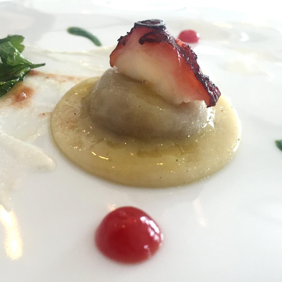 Torre del Saracino, patata lessa, aceto di uva del collio, colatura di alici ed un pesto di olive nere con calamaretti al vapore ripieni di verdure e crostacei