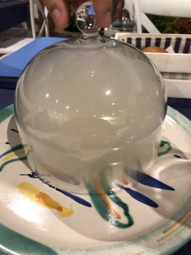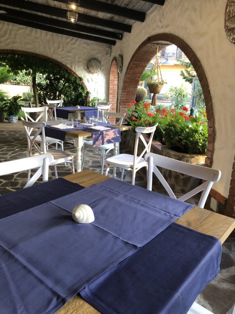 La saletta esterna è la stessa di tanti anni fa, manca il mare, come allora, ma i gerani e altri fiori, ci sono e danno colore e poi, diamine, se uscite in buona compagnia, che avete da guardare che non sia la vostra preziosa ospite? Troppo spesso vedo tavoli da due, in cui il compagno del pasto è il telefonino o il mondo intorno. La tomba 2.0 del galateo.