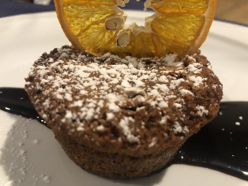 “Un dolcino?” Naturalmente. Dribblo la cheescake con mascarpone e fichi e da cioccolatomane impertinente, mi dirigo sulla caprese al cioccolato. Molto buona, ma qui l’applauso scatta a metà per via della salsa a specchio che non è all’altezza del dolce, e che Vincenzo mi ha garantito, modificherà.