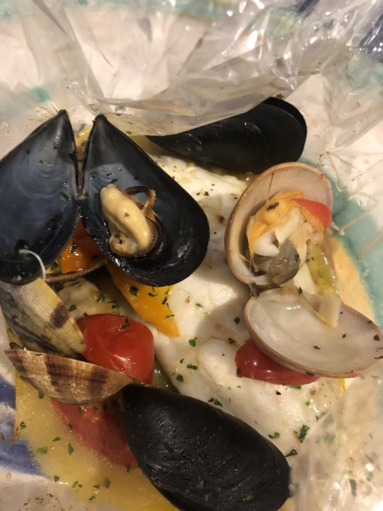 Il piatto successivo è l’occasione per vedere una preparazione che da tanto non assaggiavo, il pesce al cartoccio. Mi ha affascinato sempre questa tecnica di cottura, perché quando ti arriva quel fagotto a tavola, hai sempre quel sorriso fanciullesco, nello scartarlo, di quando aprivi la calza della befana. Nella mia calza, pardon, cartoccio, ci sono un filetto bianchissimo di pezzogna, senza neanche una spina (spinato cosi bene, solo la sogliola al bistrot di Bocuse a Lione) vongole, cozze e fasolari, e un piacevole sughetto, che è la scusa perfetta per provare il pane di Vincenzo (fa pure il pane!!!).