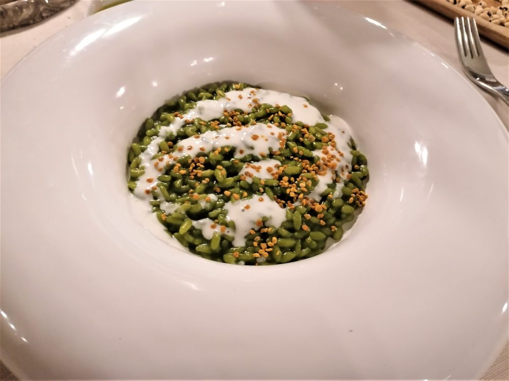 Il risotto agli estratti di cicoria, blu di capra e polline riesce a integrare il carattere imponente del polline in un assaggio originale.