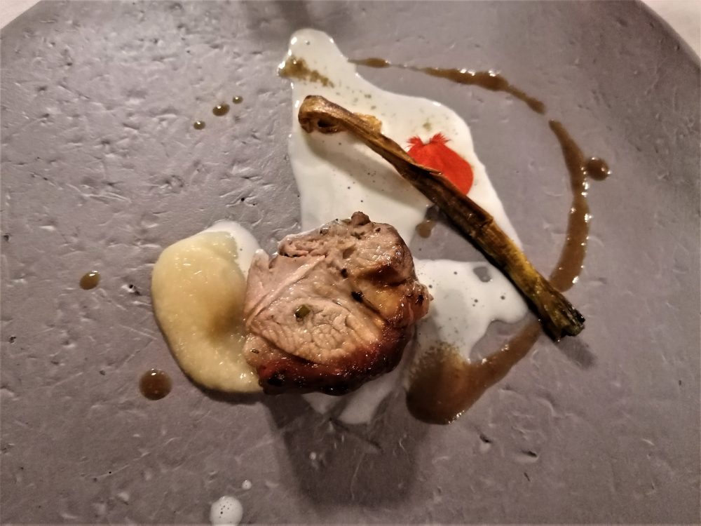 Si procede con lo stracotto di maiale brado, farro spezzato, tartufo nero, broccoli e senape. Il maiale è quello degli allevatori umbri Stile Brado, la qualità si sente tutta. Così come si fa valere una mano attenta sull’animella glassata, mela e cavolo.