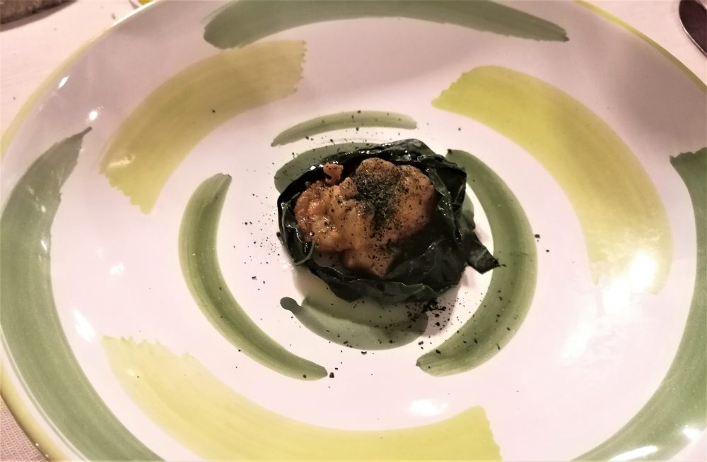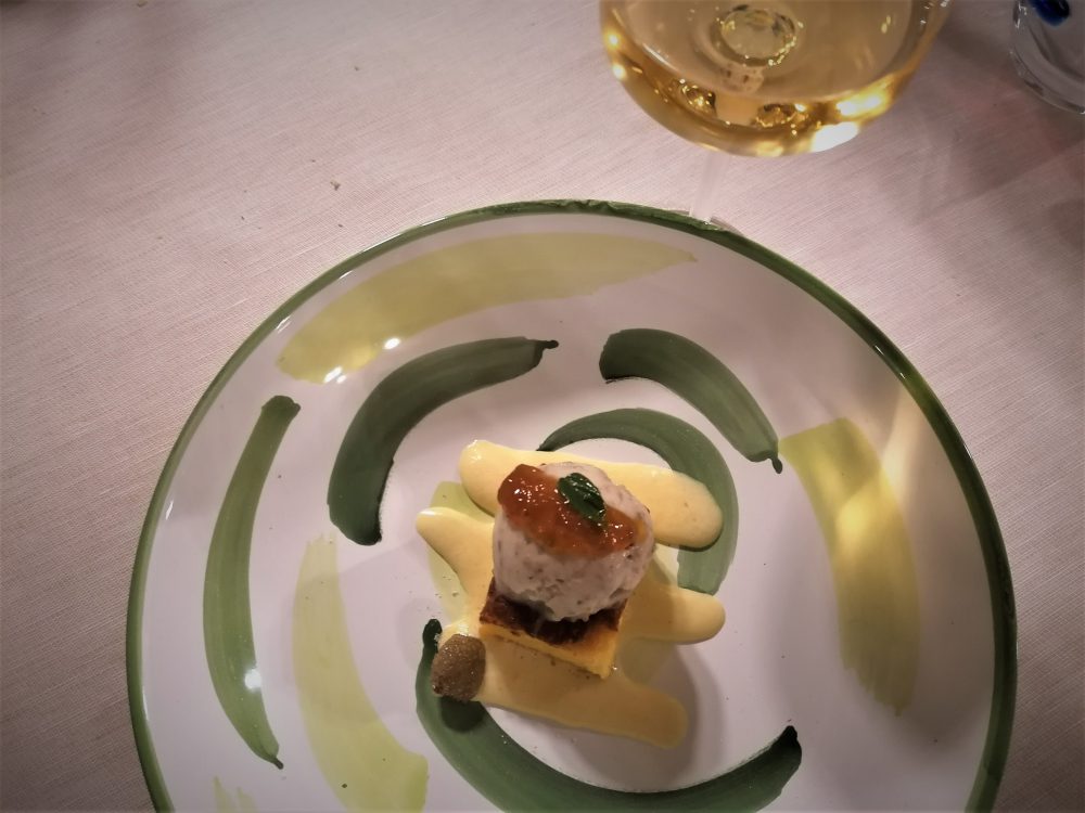 Sempre intrigante il Benvenuto grazie al quale alcuni classici della cucina locale povera si trasformano in raffinati assaggi perdendo ogni eccesso di rusticità: pane sciapo con bavarese all’olio d’oliva; Macaron alla salvia con fegatini; crocchetta di porchetta. Gusti fedeli e bilanciati, con sapidità molto controllata.
