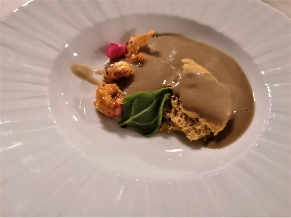 La zuppa di lenticchie, gambero di fiume e castagne sorprende per il ribaltamento delle aspettative da presentazione scritta: la zuppa è in crema ad accompagnare il gambero appena scottato e delicato insieme a una spugna alle castagne.