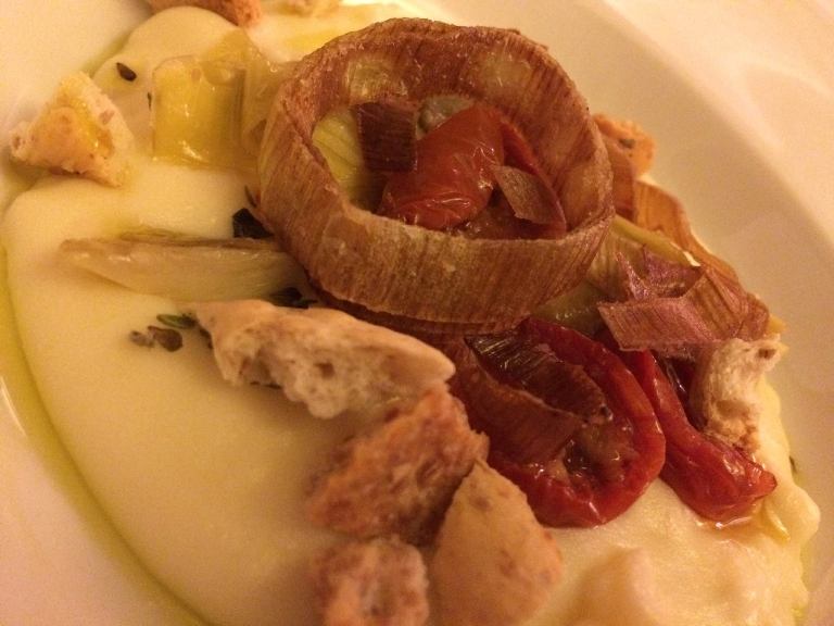 Perbacco, cialledda personalizzata e rivista con purea di patata, carciofo spadellato, pomodorini grigliati, sponsale fritto e frisa sbriciolata
