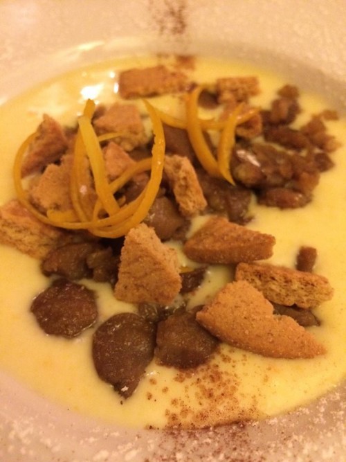 Lo ammetto, non sono molto attendibile nella valutazione dei dessert, visto che non amo molto il dolce, ma il semifreddo alla liquirizia mi conquista senza esitazioni; e non manca il dessert di castagne, aromatizzate con liquore Strega e crema all’arancia, come me pure il tortino di pere è da veri golosi.