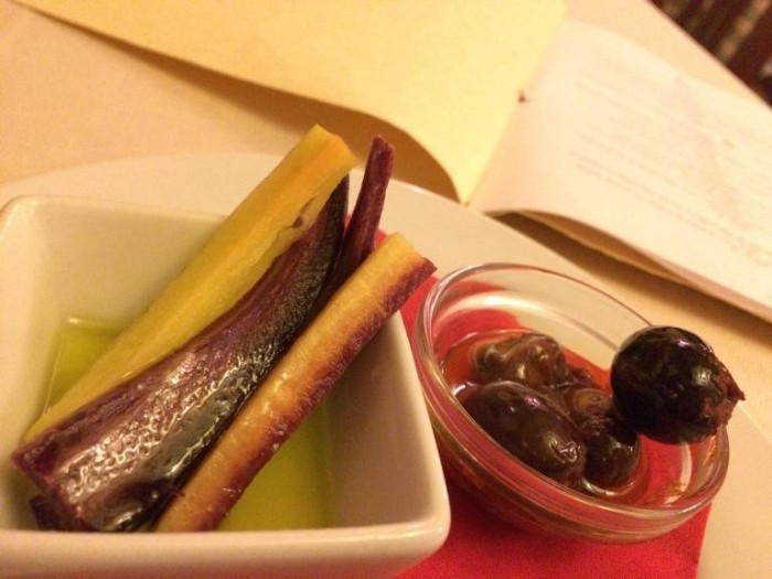 L’inizio è da classico “apristomaco” alla barese, con carota di Polignano, extravergine e olive nolche spadellate, naturalmente con pane e taralli.