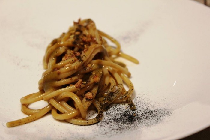 “Terroir” che bello trovare la pasta secca nei ristoranti importanti. Avviene poco perché il rischio di sbagliare una cottura fa paura a tanti, anche ai migliori. Con chiari rimandi marchesiani, gli spaghetti sono a temperatura ambiente, così difficili che diventano golosi, la pasta secca resta il centro, tutta ruota intorno in maniera vorticosa, particolarmente appagante.