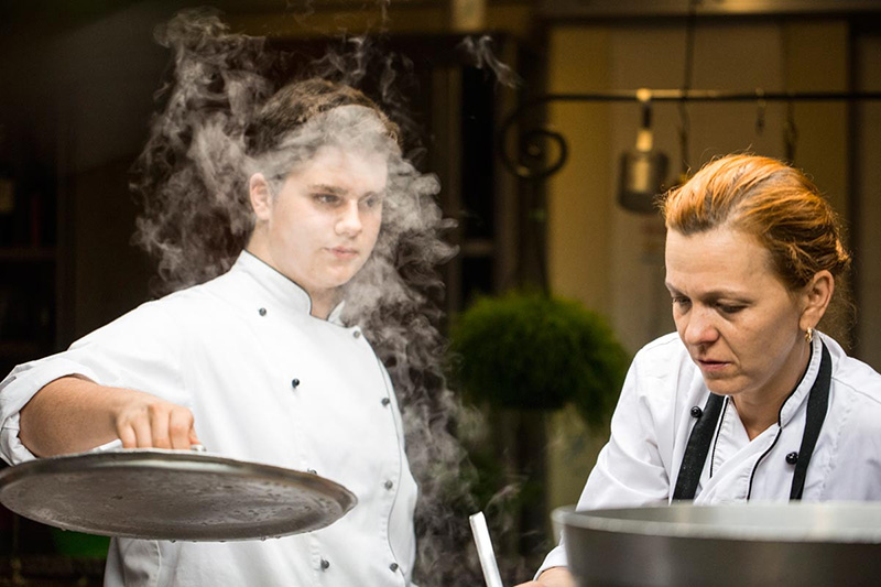 Così la paura si è trasformata in un nuovo modo di sentire amore, verso tutto. Per un momento ho persino creduto possibile che questo nuovo sentimento sopito sotto le regole dell’interesse personale, del dio danaro, dell’ottuso sfruttamento/inquinamento globale si fosse risvegliato nei cuori della gente perbene e che ci fosse data la possibilità di resettare il mondo, la possibilità di un nuovo vero inizio. E invece no, il gregge non immune alla stupidità torna inesorabile a maltrattare la vita, pensando che quel modo di agire sia vera libertà. La seconda chiusura totale per noi è stata la delusione di aver fallito. La gente continua a morire, siamo in balia di un virus intelligente, subdolo e malefico. Il mondo non cambierà ma noi siamo cambiati. Ancora più sicuri dei veri valori ci stiamo dedicando a deconcettualizzare il nostro lavoro. Un po’ come quando andava di moda la cucina destrutturata, vedere un piatto completamente nuovo usando gli ingredienti originali. Così il mio giovanissimo papà con la sua prudente cuoca Janna e il serio nipote cuoco Francesco hanno studiato come rendere trasportabili i nostri piatti, cioè come farli arrivare sia caldi che belli a destinazione. Questa missione è stata completata con successo e non sarà mai più abbandonata. Ci sono persone che per diversi motivi non possono andare al ristorante, è una gioia vedere la loro felicità quando ci aprono la porta di casa. Poi abbiamo fatto nuovi lavori nel ristorante, abbiamo aperto una graziosa enoteca. A lavori ultimati il commento di papà è stato “mia figlia è bravissima a realizzare i miei sogni”. Impagabile! Un’altra cosa importante è che acquistiamo 100% italiano, possibilmente biologico e da piccole realtà. Mio papà vorrebbe proiettare il tricolore sul ristorante, ci sentiamo orgogliosamente Italiani, la nostra Italia non teme nessuno. Per ora non ci sono ancora riuscita ma non è detto… Ecco, questo è il nostro contributo al mondo.