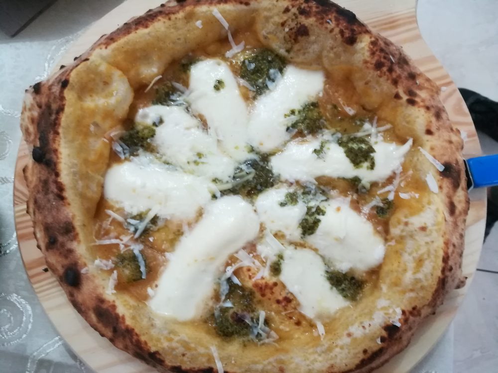 Per cominciare ci facciamo portare a centro tavola la nuova proposta di Michele in tema di Pizza, la “Oro Giallo” fatta con passata di pomodorini gialli col pizzo, pesto artigianale e formaggio di pecora. La Pizza, come si può notare dalle foto, strizza palesemente l’occhio alla recente tendenza della cosiddetta “pizza a canotto” con il cornicione molto pronunciato. L’impasto si conferma scioglievole e gustoso, e gli ingredienti di condimento ben si sposano rilasciando anche un bel profumo.
