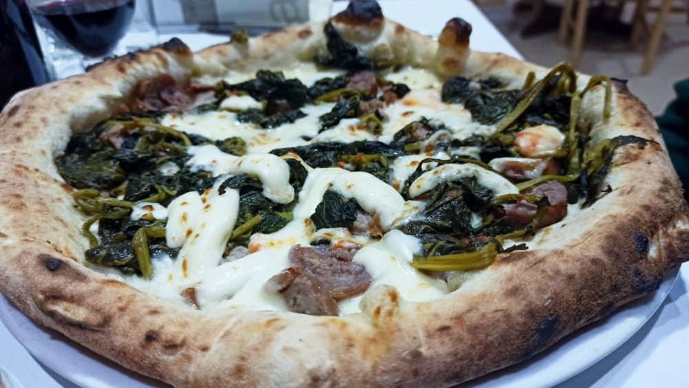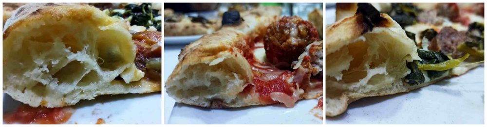 Il reparto pizzeria è stato affidato ad un giovane che con il suo impasto diretto (idratato ad una percentuale di poco superiore a quella del disciplinare e fatto con una farina tipo 00 forte per reggere le 24 ore di lievitazione all’attuale temperatura ambiente) sforna pizze anch’egli di impronta prettamente napoletana con una cottura attenta per preservare la scioglievolezza e per far sì che i cornicioni si inarchino a formare tanti cunicoli pieni d’aria.