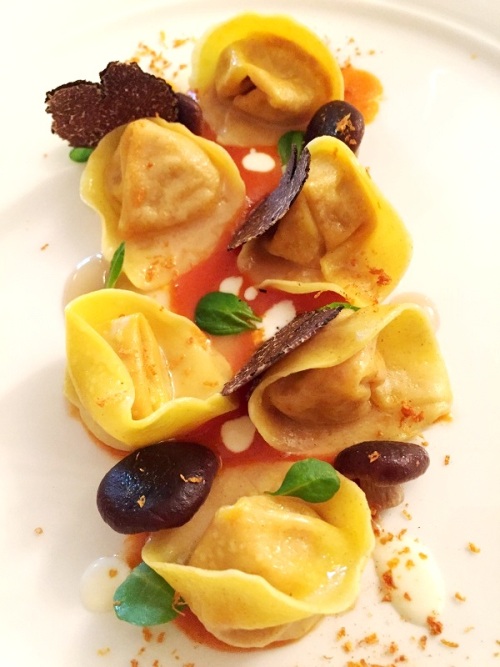 E il momento dei primi: prima un piatto classico, lo “spaghetto maruzzielli” con caviale islandese, aglio, olio, piccoli lupini e maruzzielli (sconcigli), e poi con una novità, il “Pollo che pensava di saper volare”, ossia un piatto di cappellacci ripieni alla cacciatora con tartufo “pioppino”, il tutto accompagnato con due salse, una bianca alla provola, ed una rossa alla pescatora, ben centrate.