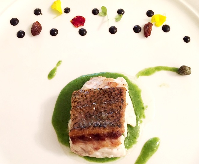 Il secondo è un’ottima cernia servita in salsa di scarola, olive e capperi, riduzione di olive, uva passa e fior di cappero.