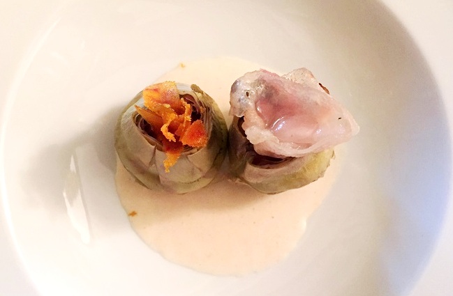 Il primo antipasto è una tartare di finocchio e straccetti di bufala affumicata, con una sensazione dolce di miele con peperoncino, il secondo è composto da due carciofi su salsa di alici di Cetara di cui il primo ricoperto da lardo con un tocchetto di salame di bufalo ed il secondo, più leggero, con bottarga di muggine. Infine un baccalà brasiliano in salsa dolce con pomodoro San Marzano, olive e capperi.
