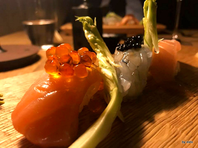 Nigiri di tonno magro e olio evo salmone balik e ikura gambero blu con tartufo.