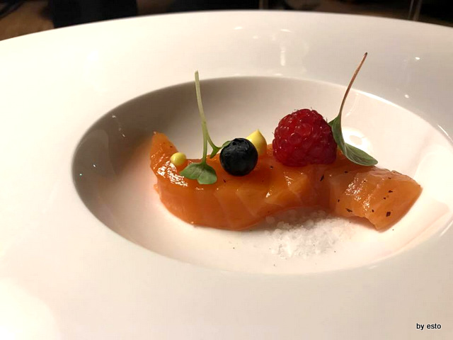 Salmone ai frutti di bosco che sarà scottato al tavolo con la tecnica shabu shabu, versando cioè sul pesce un infuso bollente.