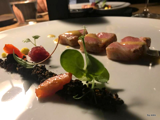 Giunti quasi come pre-dessert i cappelletti alla rapa rossa ripieno di mousseline di palamita, emulsione alla prugna fermentata e melanzane alla scapece.