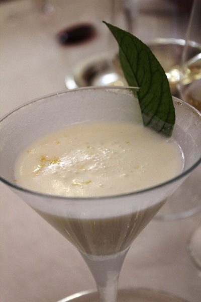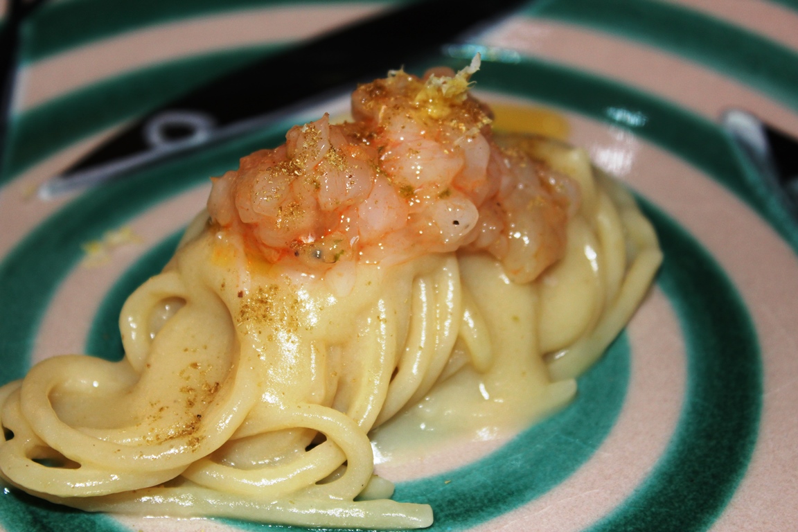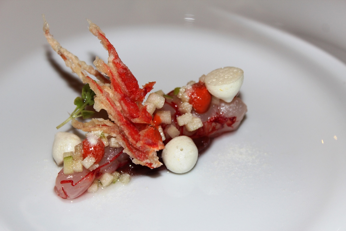 I crostacei devono essere una passione del cuoco campano, perchè riesce sempre a stupire, nel gusto e nell’abbinamento. Sensazioni a tutto tondo, dalla note amare a quelle sapide, fino a quelle acide della citronella, tutto però in grande equilibrio. La cicala è il centro gustativo, la sua dolcezza e le altre sensazioni girano intorno, come in una piccola giostra palatale.