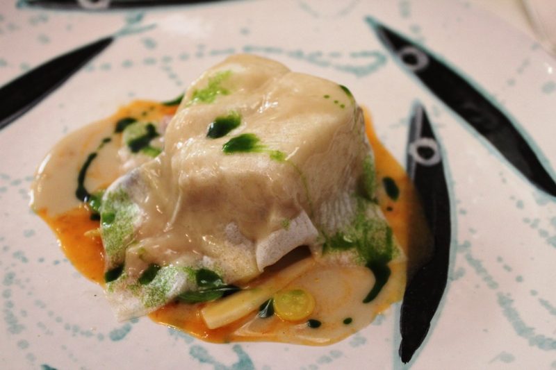 Il baccalà che gira per l’oriente però rimane saldamente ancorato ai sapori e ai profumi napoletani. Il latte in realtà è di cocco, però la sfoglia di verza e le altre verdure, hanno il sapore e l’odore delle tavole napoletane, anche qui con eleganza e grazia, senza mai rinnegare la matrice popolare di questa preparazione.