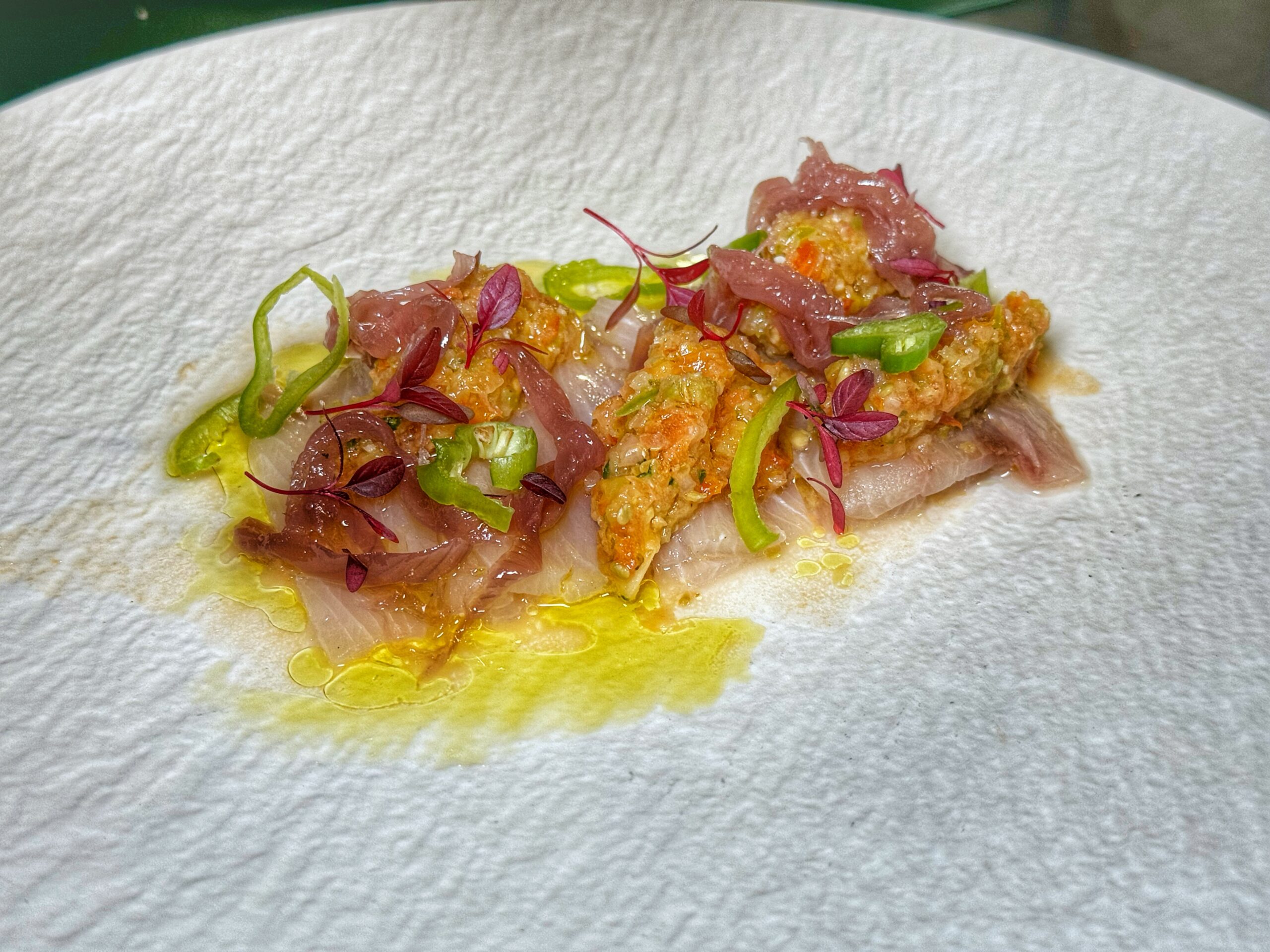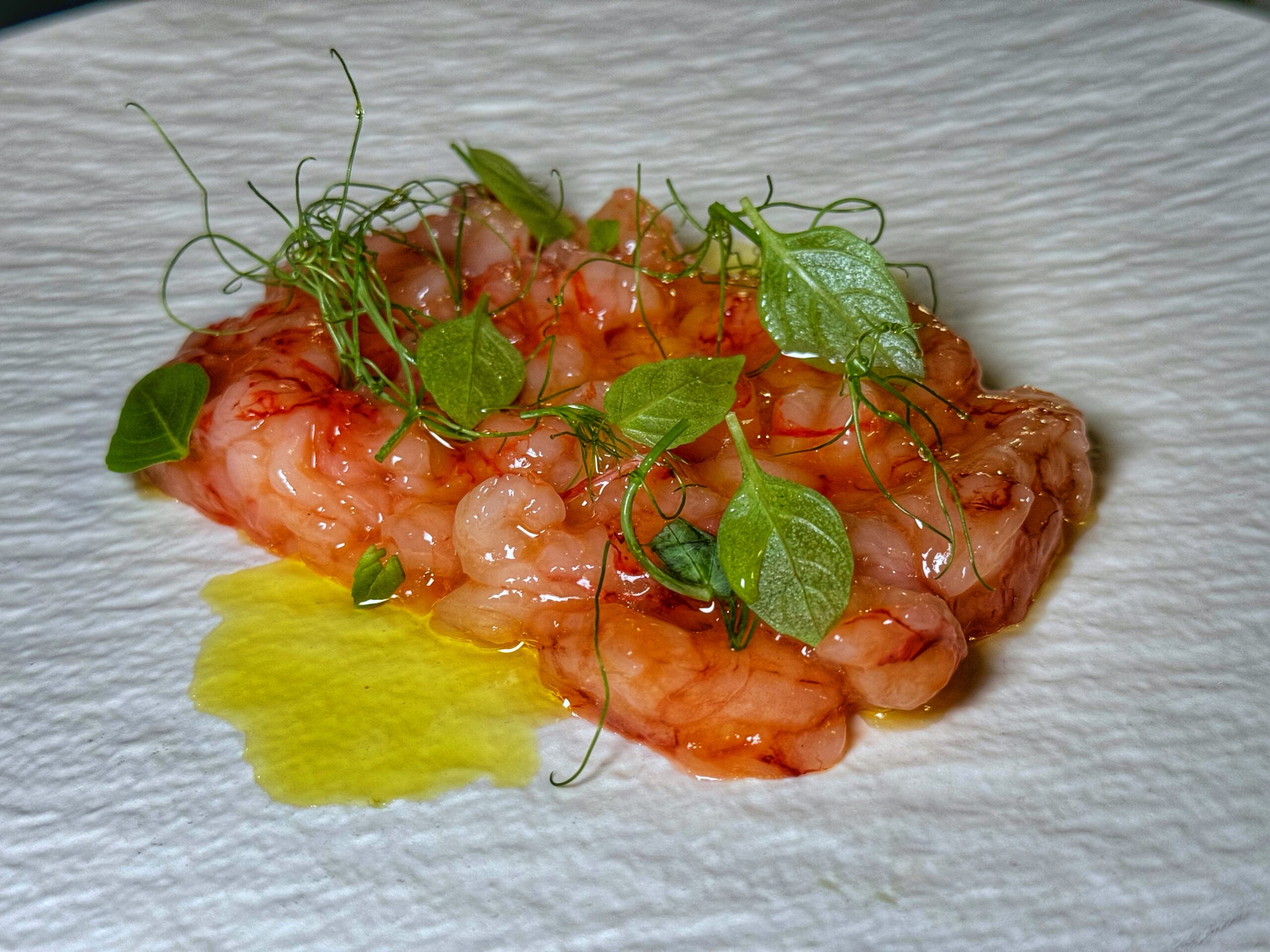 - tartare di gameroni rossi, olio evo del Cilento e sale Maldon di Sale Paestum