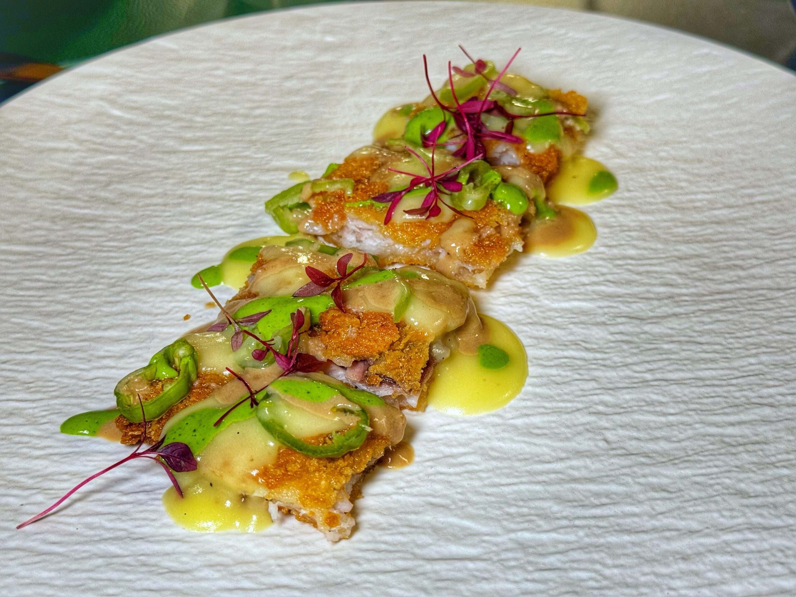 - Cotoletta di Cernia croccante con crema di patate, fois grass e friggitelli