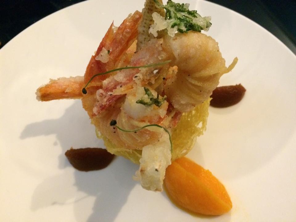 Sancta Sanctorum, Cestino di patata con tempura di gamberi e verdure, ketchup di soia e crema di carote in agrodolce