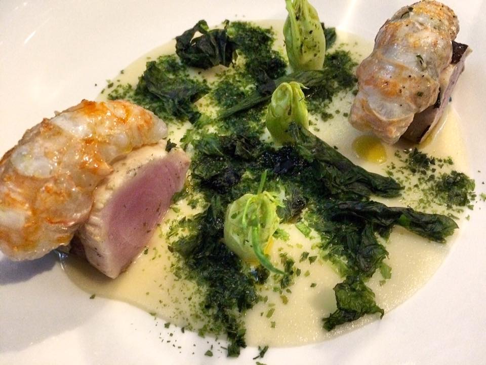 Sancta Sanctorum, Zuppetta tiepida di finocchi al gin tonic con pesce spada tataki, scampi fiammeggiati e puntarelle saltate