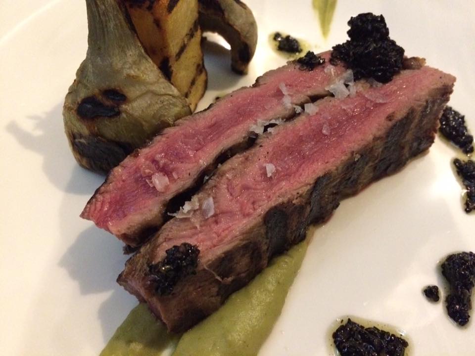 Sancta Sanctorum, Pluma iberica con carciofi, parallelepipedo di patata con vinagrette al sesamo nero e soia
