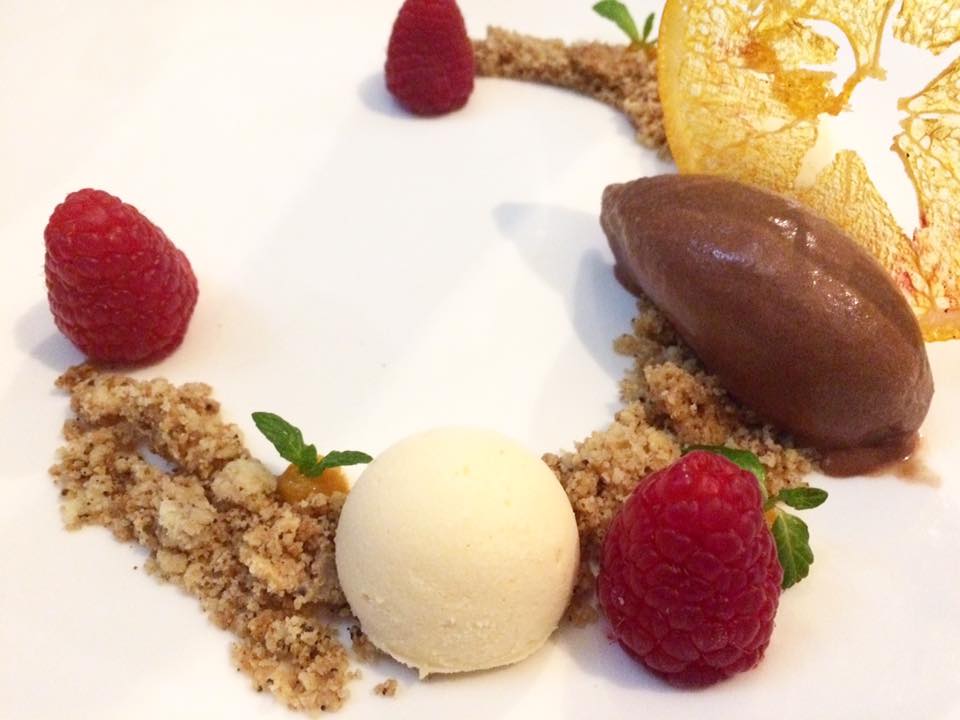 Sancta Sanctorum, Gelato al cioccolato con mousse di ricotta, crumble alle spezie, crema all’arancia e lamponi